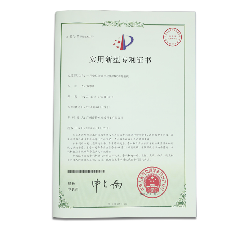騰卓機(jī)械專利生產(chǎn)證書,專業(yè)制造包裝設(shè)備的生產(chǎn)廠家,全自動及半自動的洗瓶機(jī),烘干機(jī),灌裝機(jī),旋蓋機(jī),貼標(biāo)機(jī),套標(biāo)機(jī),打碼機(jī)等非標(biāo)定制自動化包裝生產(chǎn)線