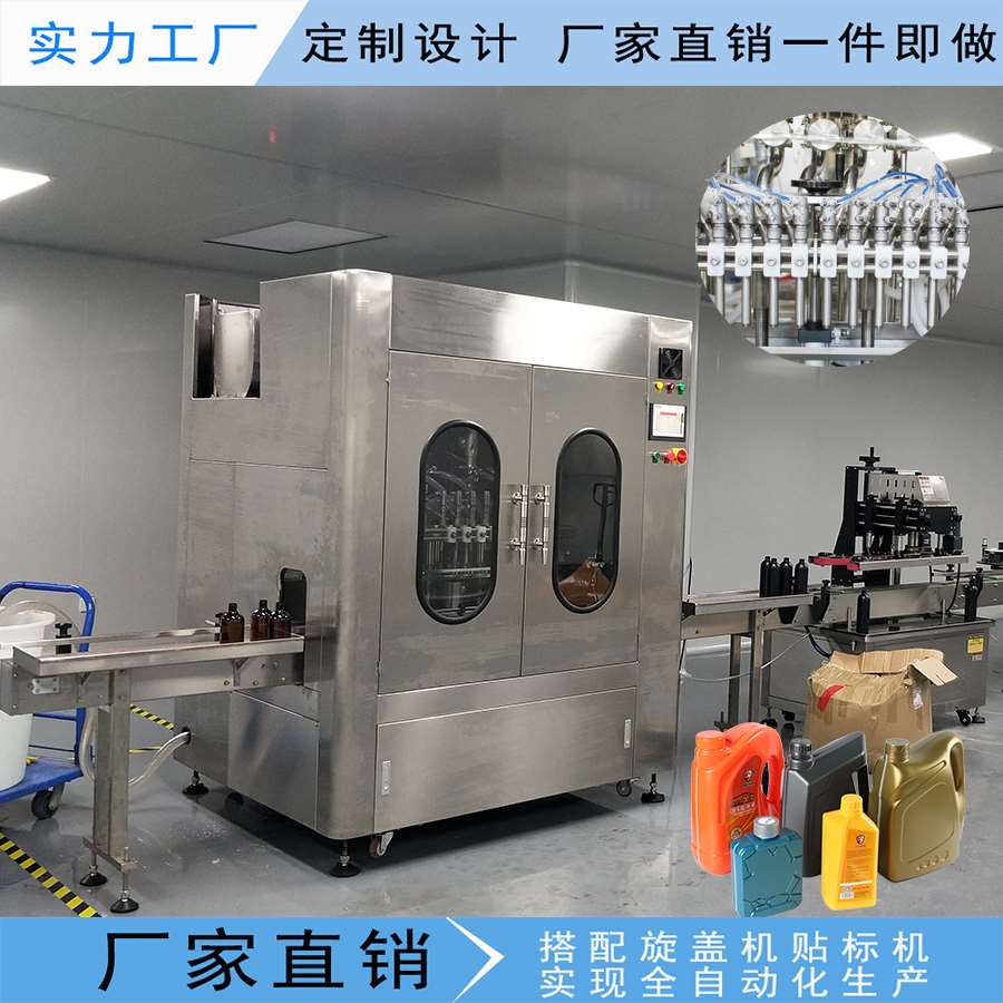 此生產(chǎn)線(xiàn)主要應(yīng)用于日化廠,化工廠,汽車(chē)用品等行業(yè)。例如:洗衣液,洗潔精,洗發(fā)水,沐浴露,潤(rùn)滑油,剎車(chē)油,汽油添加劑等,設(shè)備采用先進(jìn)的光、電、氣一體化自動(dòng)控制系統(tǒng),實(shí)現(xiàn)進(jìn)瓶,定位,灌裝,出瓶自動(dòng)化生產(chǎn)。